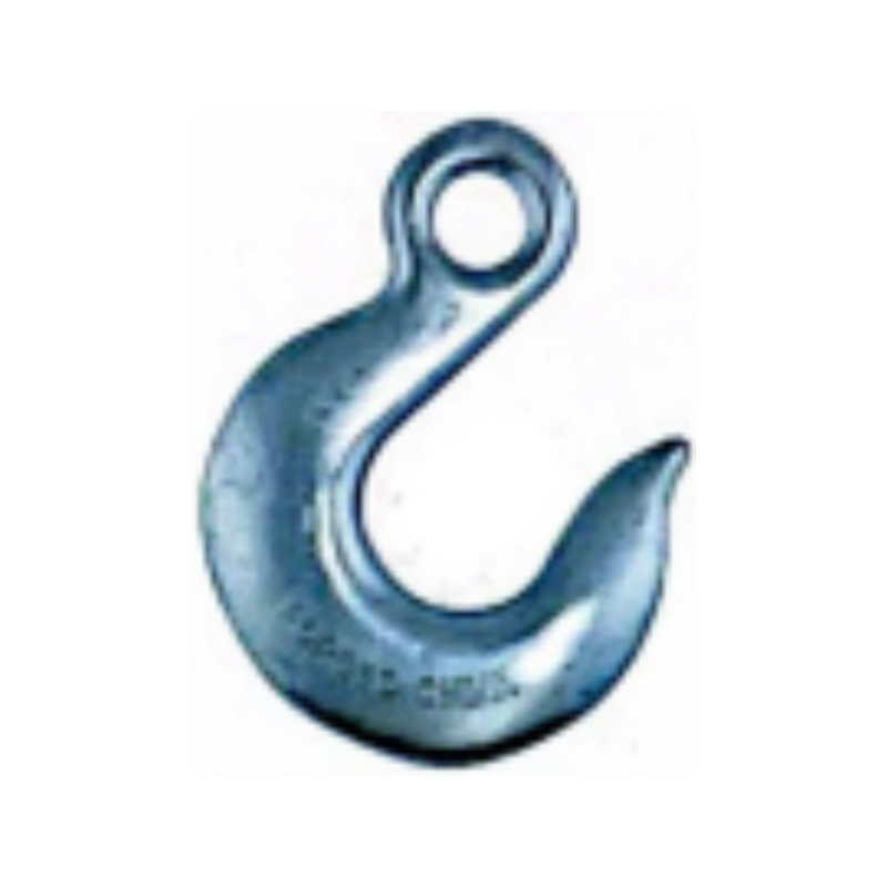 The alloy steel eye slip hook is a lifting connector compatible with various chain sizes, available in seven models (stock numbers GMC450250 to GMC450750) from 1/4-inch to 3/4-inch, to meet diverse load requirements. Its working load rating (W.L.L.) increases with chain size, from 2,750 lbs (1/4-inch model) to 19,250 lbs (3/4-inch model), making it suitable for light, medium, and heavy lifting operations.